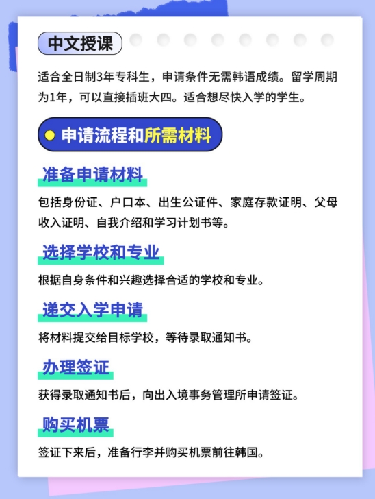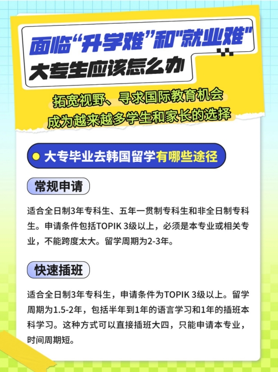 大專學(xué)生申請韓國本科可以插班或者常規(guī)申請,拿到本科學(xué)位之后,可以繼續(xù)申請韓國的碩士。